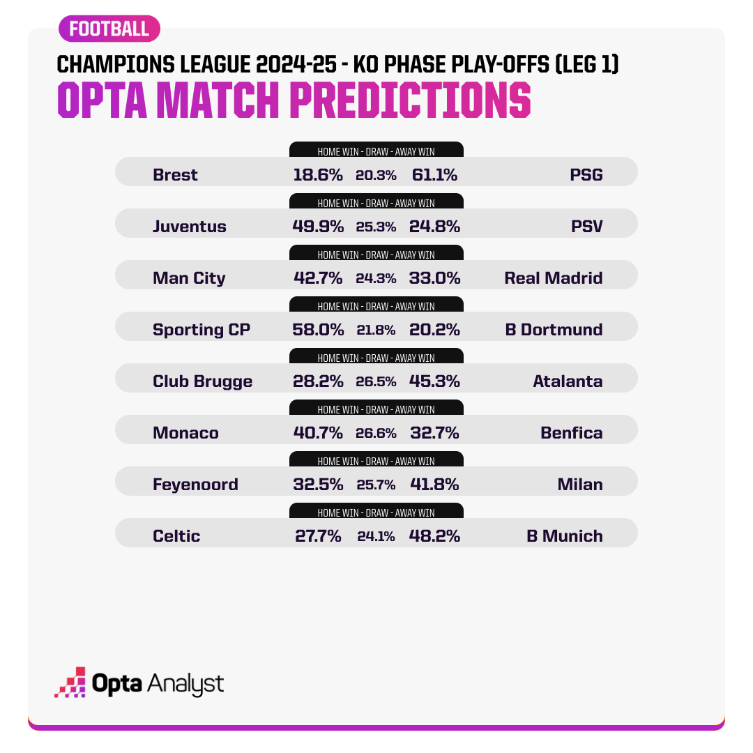 北京时间2月12日01:45开始,2024-2025赛季的欧冠联赛淘汰赛附加赛的8场对决即将在16支球队之间展开。为了争夺一个晋级欧冠1/8决赛的名额,对阵双方将通过主客场的形式决出更终的结果。