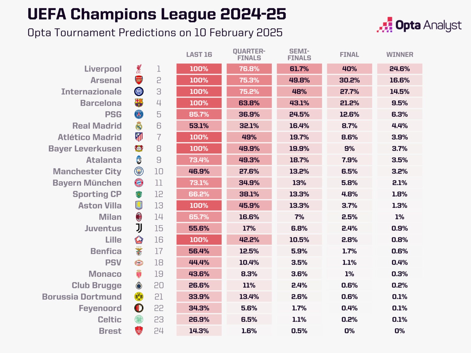 欧冠大数据:无论是超级计算机还是Opta,利物浦都是冠军热门