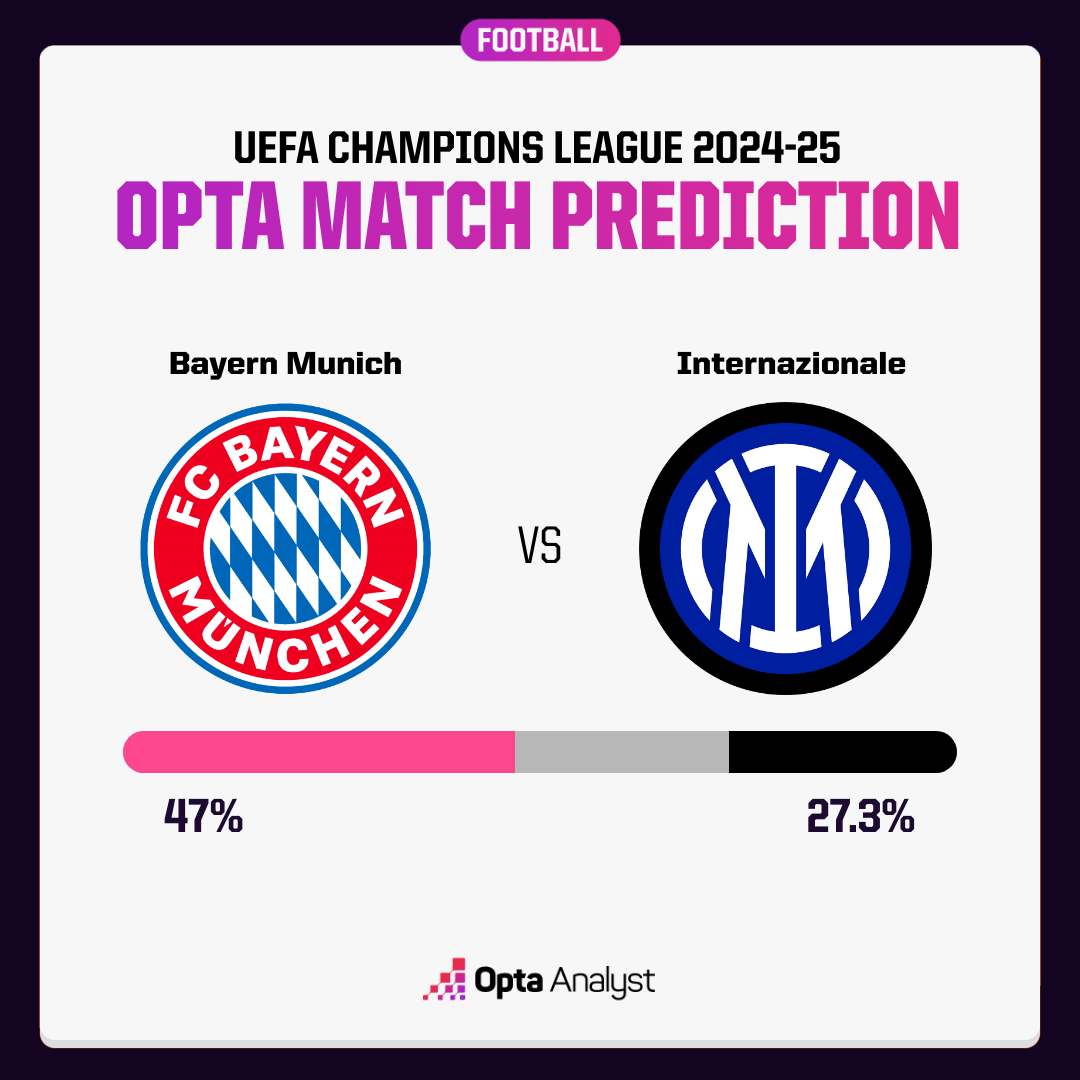 而在Opta的预测中,虽然拜仁缺兵少将看上去难以有所作为,但其实他们的主场优势依然不可忽视--拜仁胜,47%;国米胜,27.3%;平局,25.7%。