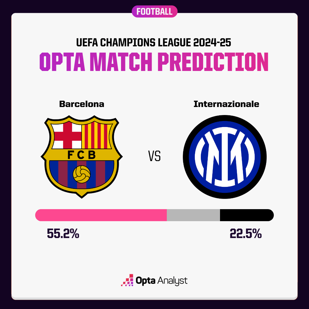 从Opta的预测来看,似乎是这样--巴萨胜,55.2%;国米胜,22.5%;双方平局,22.3%。