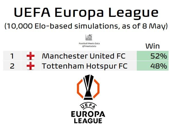 而同样来自于Football Meets Data发布的更新夺冠概率来看,曼联目前以52%的概率微弱领先于热刺的48%。