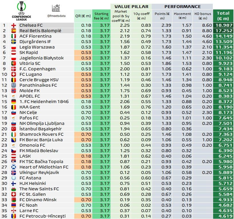 随着欧联和欧协联半决赛的结束,Football Meets Data也发布了更新的奖金排名。而在这其中,英超球队无疑成为了更大的赢家--欧联赛场的曼联和热刺,目前均获得了超过3500万欧元的奖金;而欧协联赛场的切尔西,则是有着超过1800万欧元的奖励。