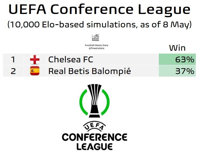而在更新的夺冠预测中,切尔西以63%的概率大幅领先于贝蒂斯的37%。