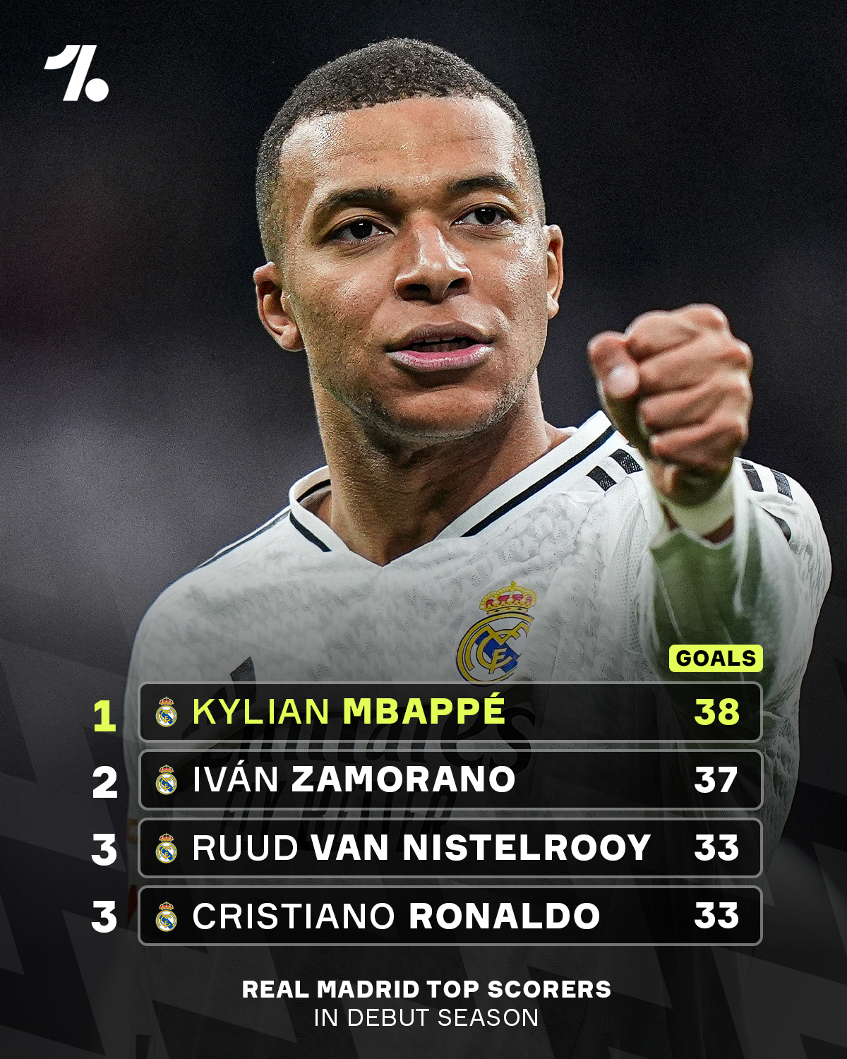 而在皇马阵容,或许唯一能够值得庆贺的球员就是姆巴佩了--凭借本场比赛的帽子戏法,姆巴佩创造了新援加盟第一个赛季以来的进球纪录。目前已经打进了38粒进球的他,已经超越了范尼和C罗和传奇球员的成绩,目前位居新援第一赛季进球榜的第一位。