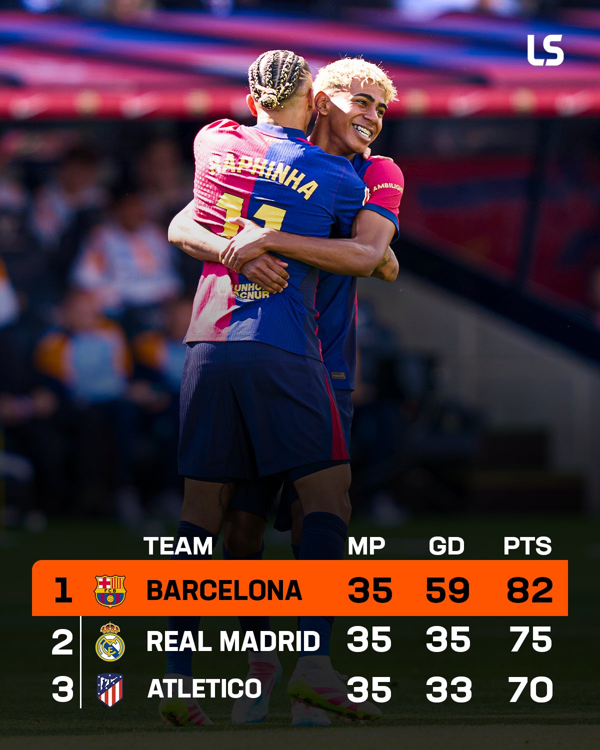 在目前更新的积分榜中,35场比赛已经拿到了82分的巴萨,目前领先皇马7分。在赛事只剩余3轮的情形下,巴萨只要在下一场能够取胜西班牙人,那么球队就将提前两轮捧起24/25赛季的西甲联赛的冠军了。
