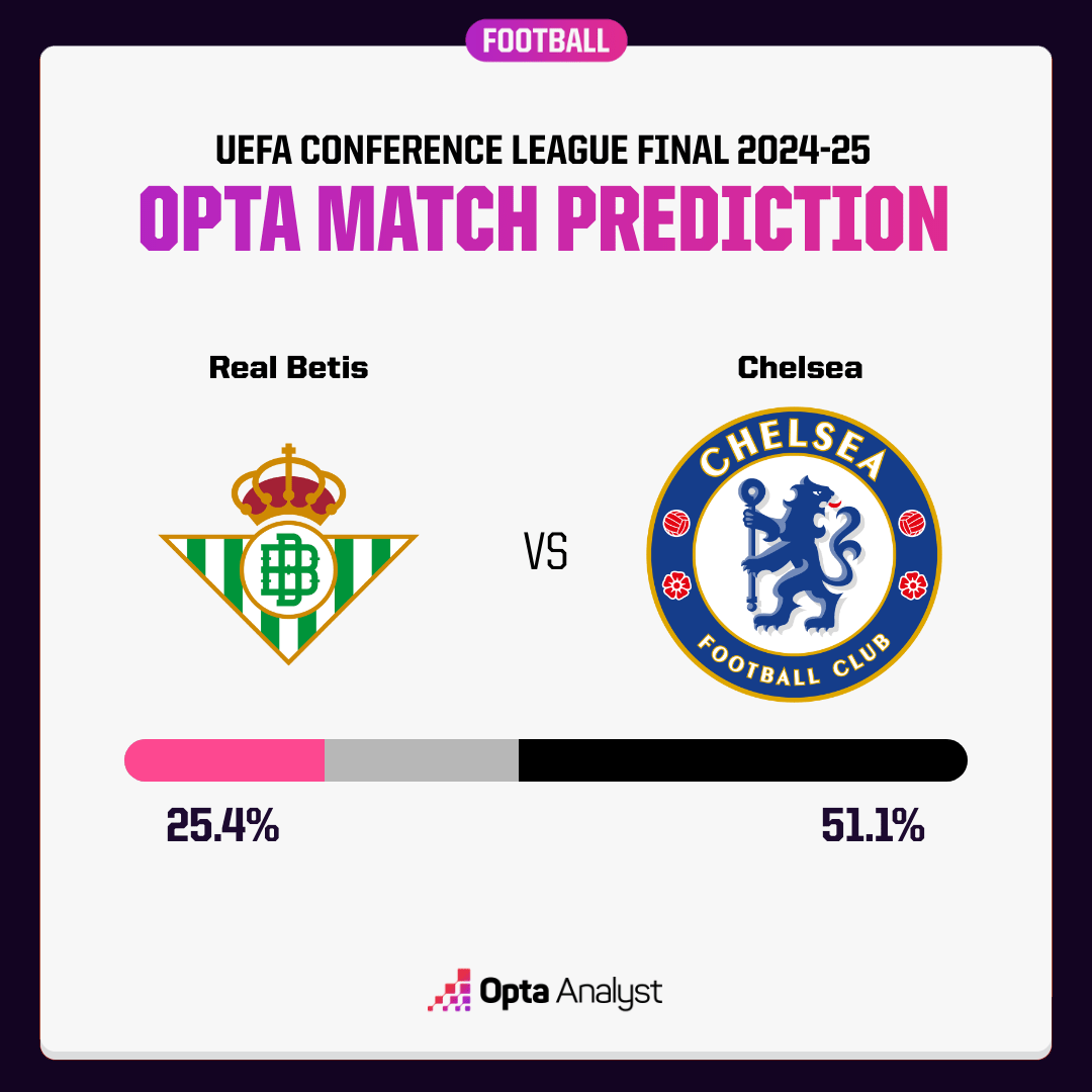 当然了,来自Opta的预测,其实也并不看好贝蒂斯--贝蒂斯胜,25.4%;切尔西胜,51.1%;双方平局,23.5%。
