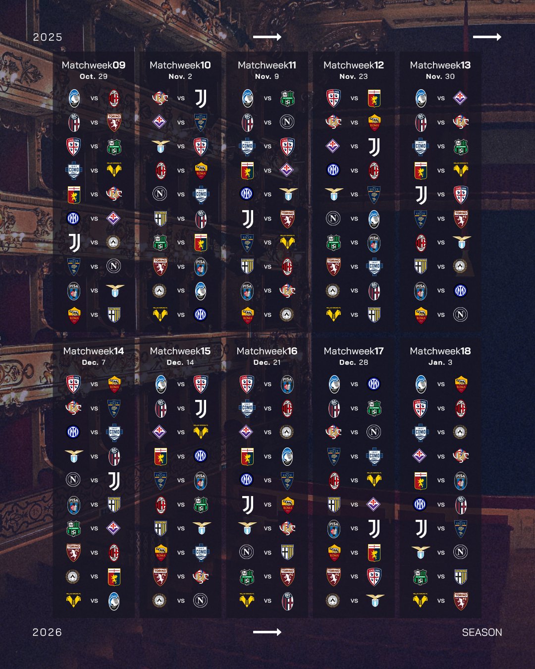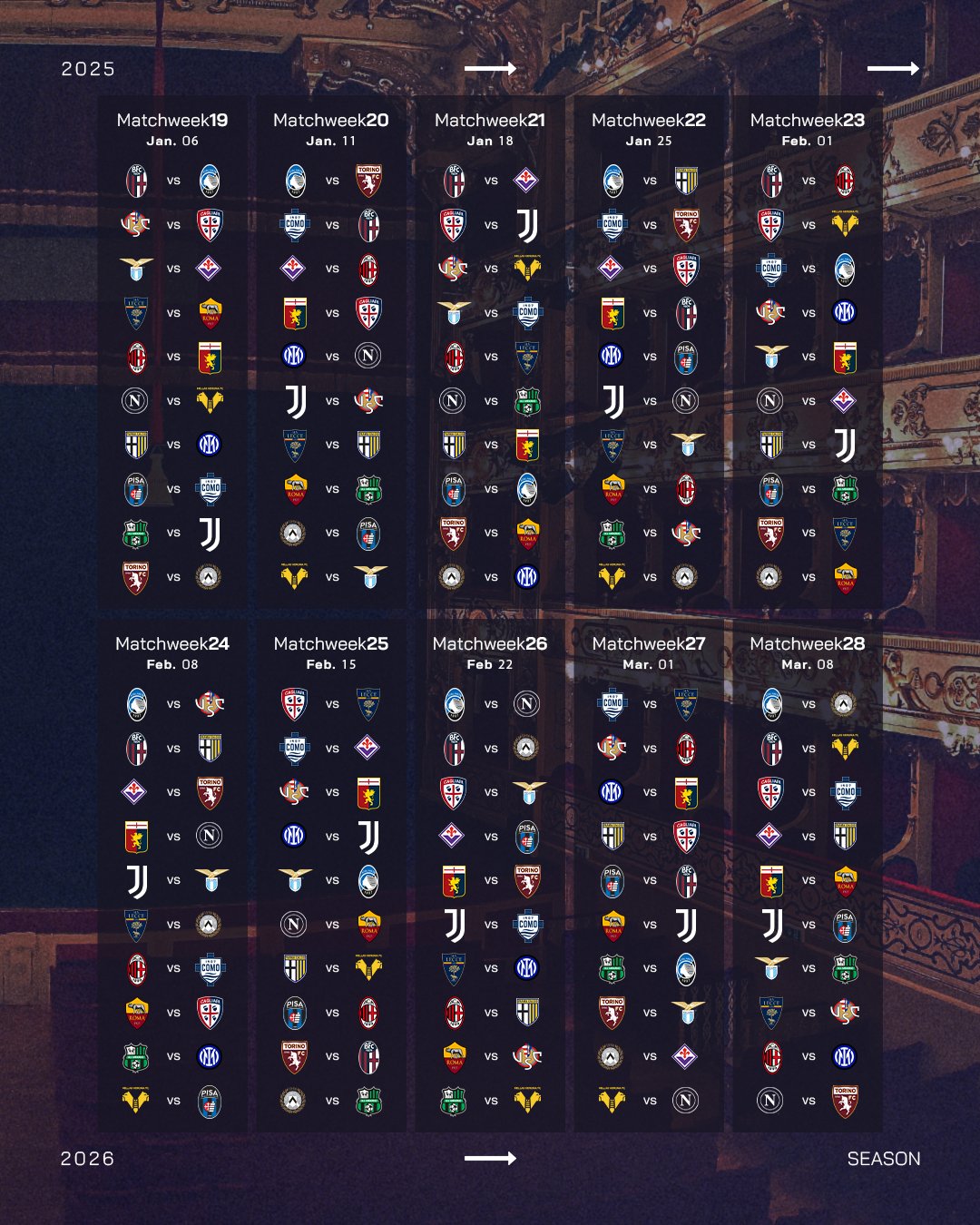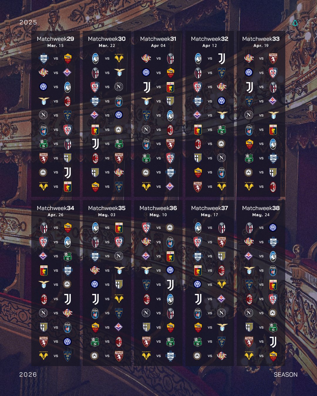 近日,意甲官方发布了2025-2026赛季的联赛38轮比赛的对阵形势和时间安排。新赛季的意甲,第一轮比赛将于2025年的8月24日开打,而更后一轮将在明年的5月24日进行。