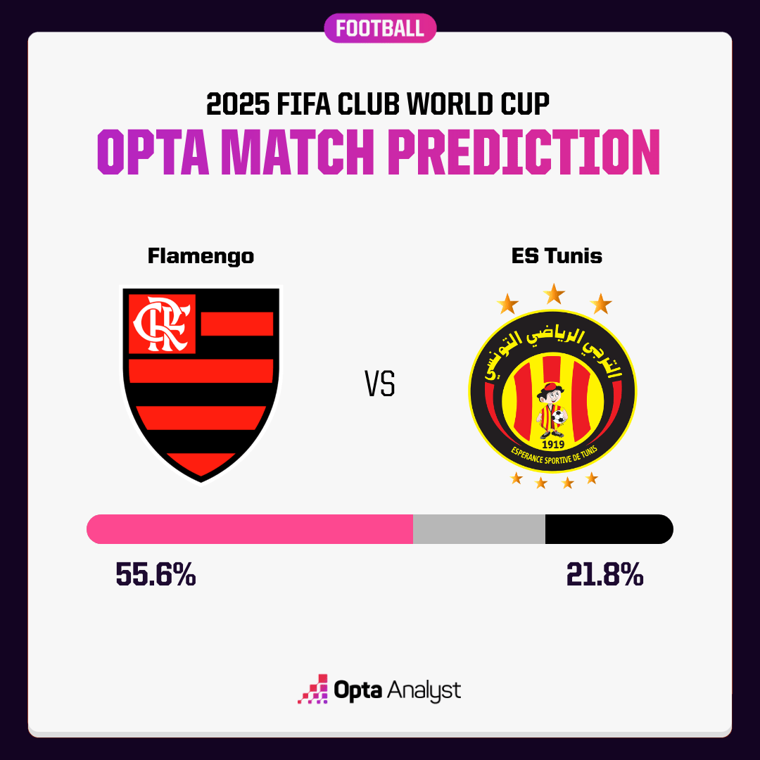 尽管优势不像切尔西那么大,但弗拉门戈其实取胜也应该毫无压力--弗拉门戈胜,55.6%;突尼斯希望胜,21.8%;双方平局,22.6%。