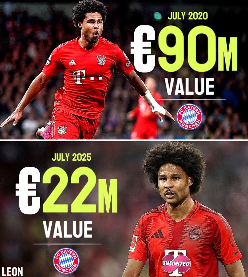 但有人增长,势必也有人下跌严重--在2020年拜仁夺取6冠王的赛季,发挥出色的格纳布里其身价一度更高达到了9000万欧元。但在经历了之后的伤病和增重所带来的一系列影响后,他的身价已只有曾经1/4还不及、2200万欧元。