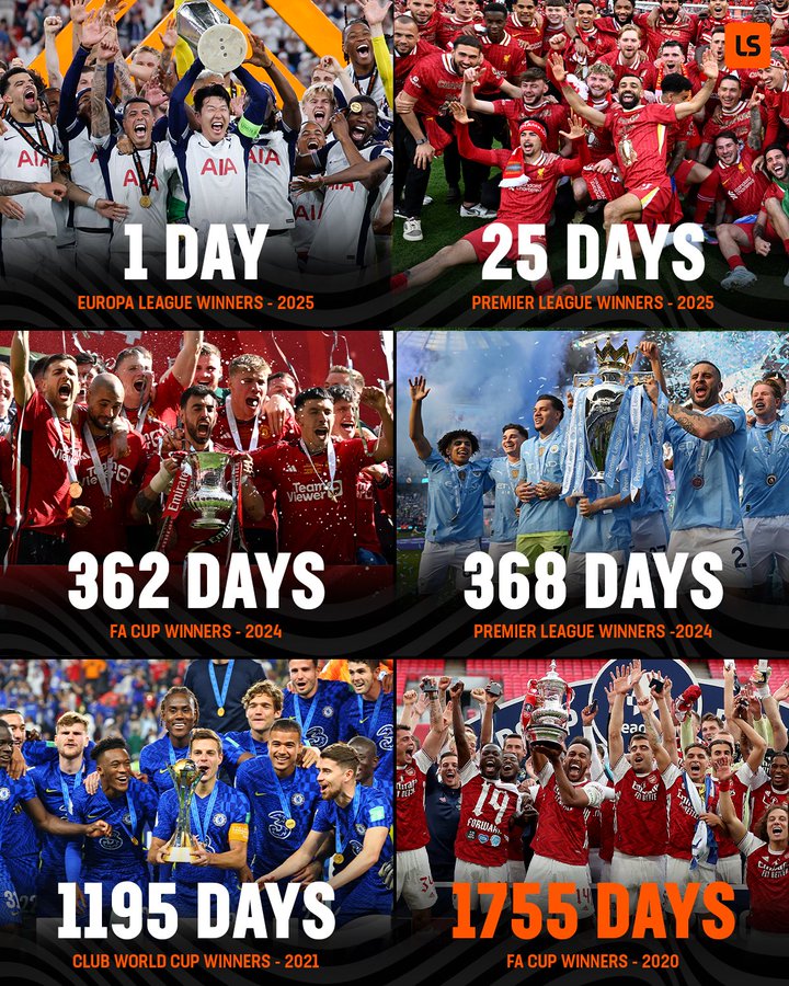 在今年的5月23日,来自于LiveScore对于英超Big6球队的上一座奖杯距今的统计,无疑就是阿森纳的成绩更差--毕竟,虽然当时的切尔西也是天数超1000的存在,但接下来的欧协联和世俱杯,人家却都是冠军。