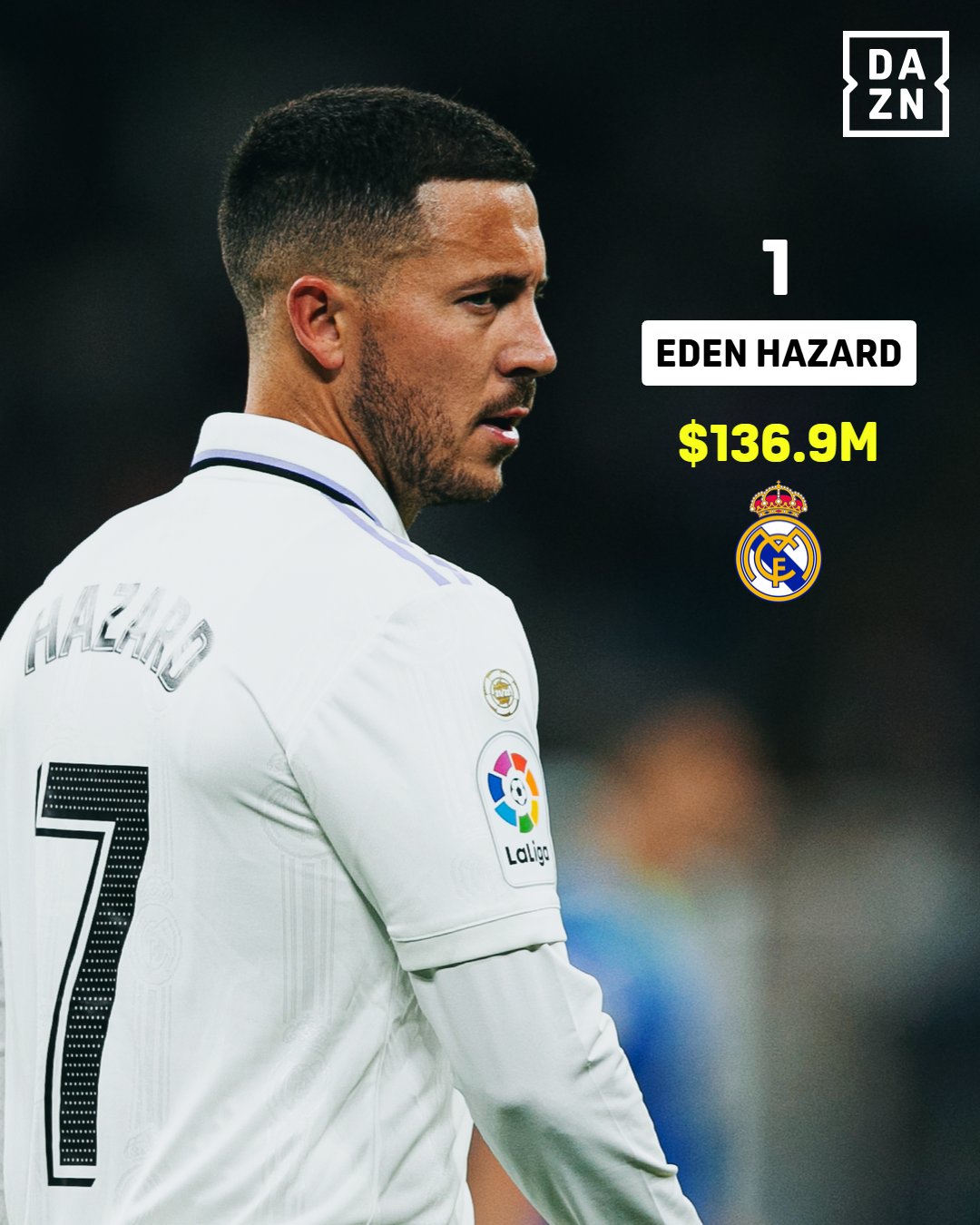 至于第一,则是被称之为皇马队史更失败的引援案例--阿扎尔,1.369亿美元。