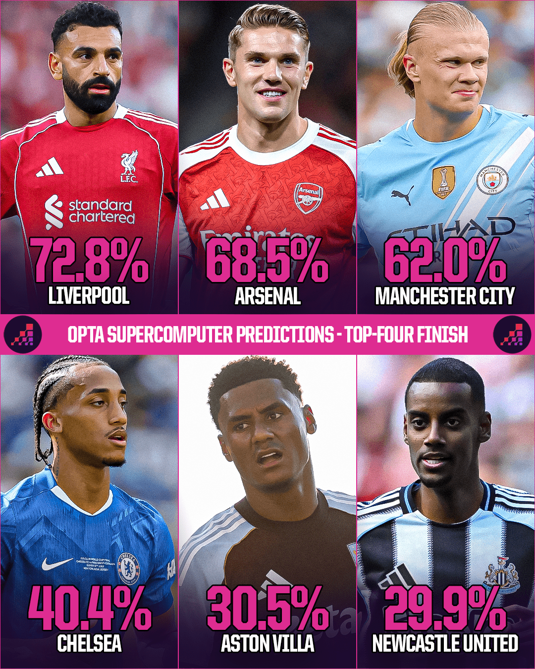 北京时间8月16日03:00,2025-2026赛季的英超联赛就将重燃战火而开启新赛季的征程。而按照惯例,Opta也发布了对于新赛季英超联赛的详细预测来为比赛预热。