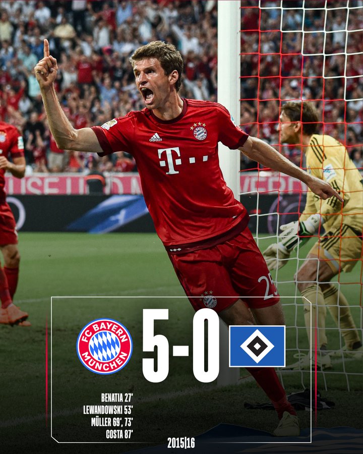 15/16赛季,作为瓜迪奥拉执教的更后一个赛季,拜仁凭借贝尔纳特,莱万、穆勒和道格拉斯-科斯塔的进球,更终主场5-0大胜汉堡。