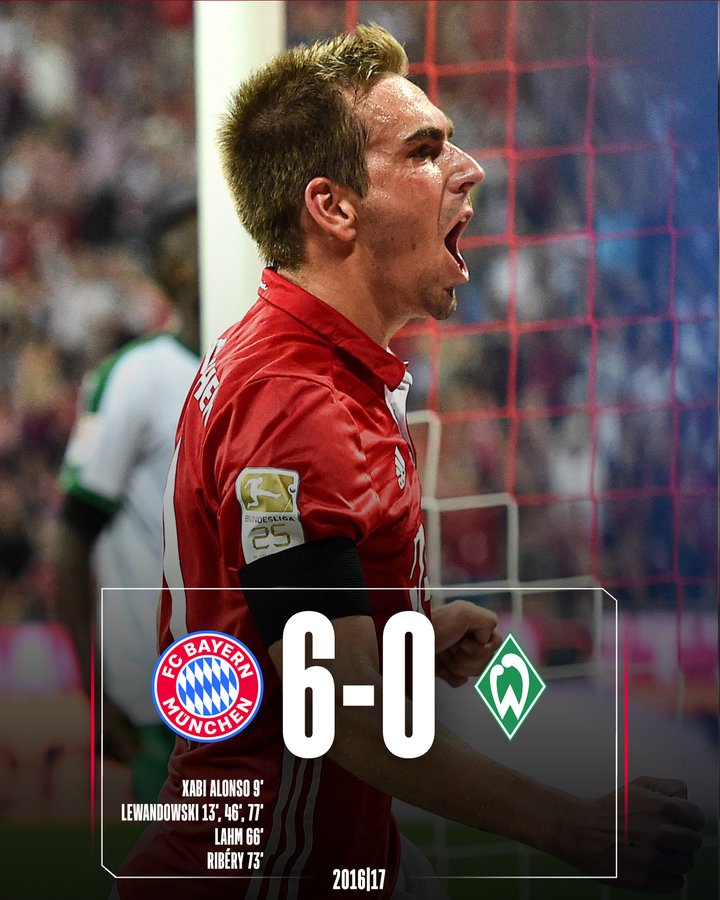 16/17赛季,作为安切洛蒂的联赛第一秀,莱万的帽子戏法帮助拜仁主场6-0大胜云达不莱梅拿下了开门红;