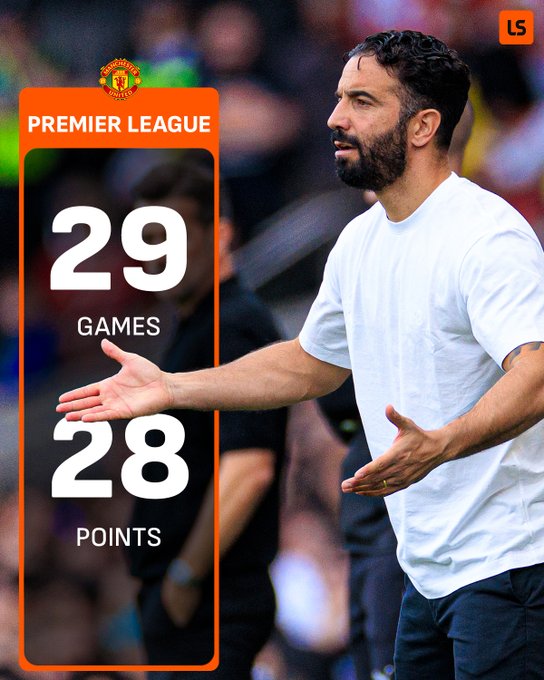 据赛后的统计数据显示,从去年的11月11日上任曼联主帅之后,阿莫林目前已经带领曼联征战了29场英超联赛,但却只收获了28个积分、场均不到1分!