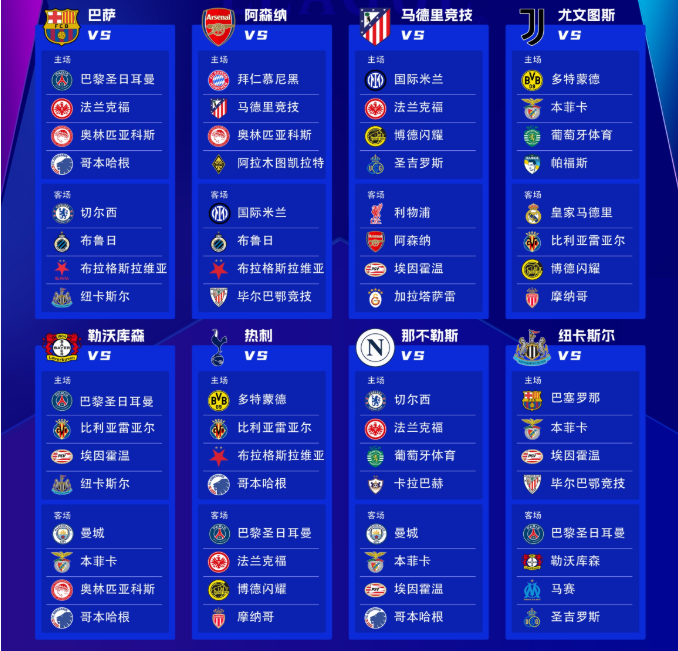 从2024/25赛季开始,欧冠将由原先小组阶段变为36队的联赛阶段,各队将与8支不同的队伍进行这8场比赛。