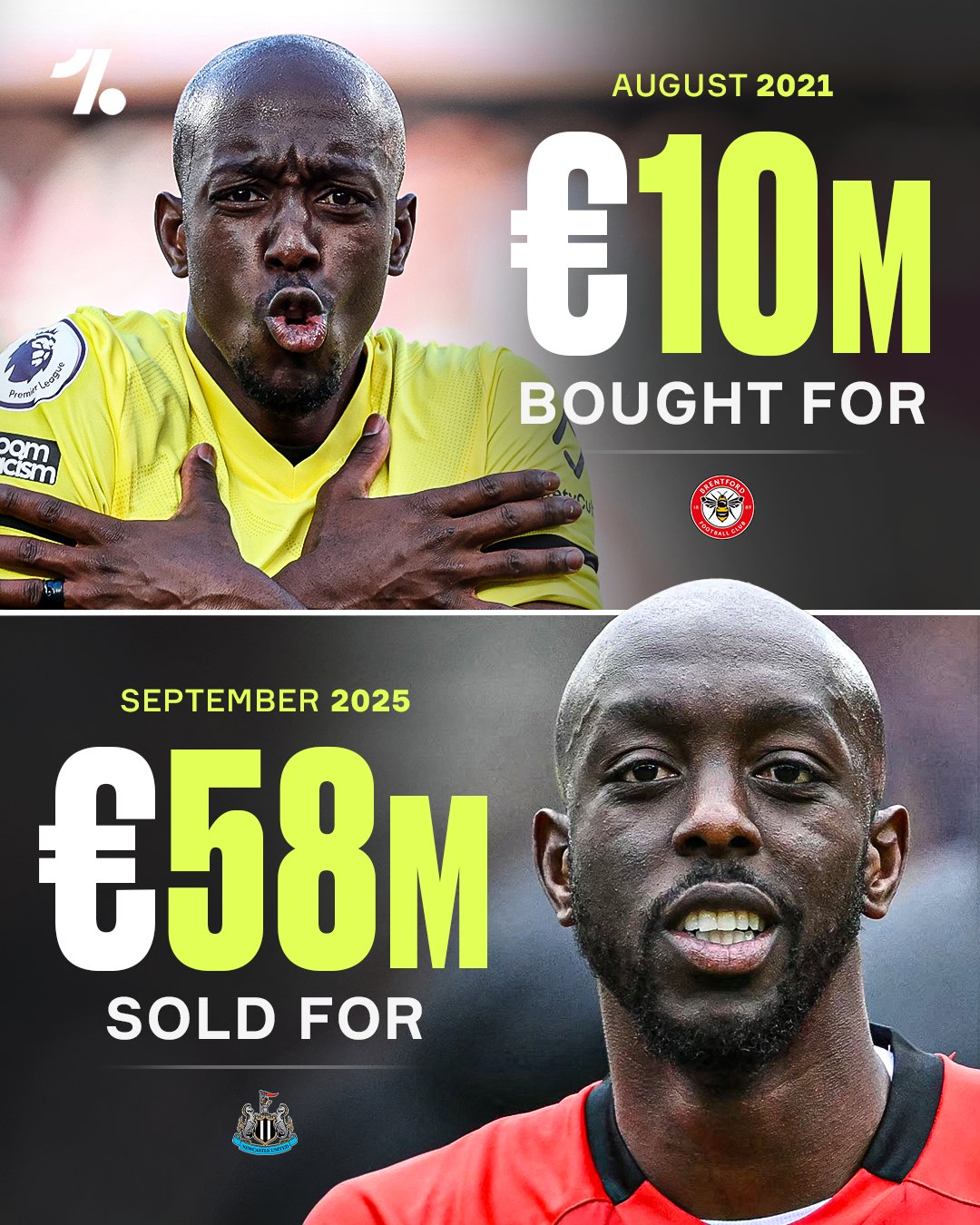 在2021年的夏天,布伦特福德投入1000万欧元的转会费从洛里昂引进了维萨。而4个赛季的时间,维萨也在小蜜蜂兑现了他的天赋和能力--更终,25年的夏窗,纽卡以5800万欧元的转会费引进了这位刚果前锋;