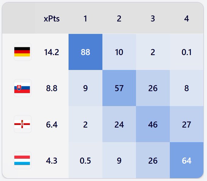 在A小组,德国队同斯洛伐克,北爱尔兰以及卢森堡等三支球队相遇,而在赛前来自于足球媒体Football Meets Data对于本小组的预测数据显示,德国队拿下本小组第一的概率高达88%,而他们的更终分数则有可能在14分左右、即4胜2平的成绩。
