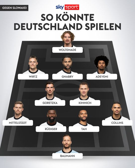 从天空体育对于本场德国队第一发11人的预测来看,球队的基本框架和结构还是没有太大变化--4231的配置下,前中后场分别由维尔茨,基米希和吕迪格所领衔。