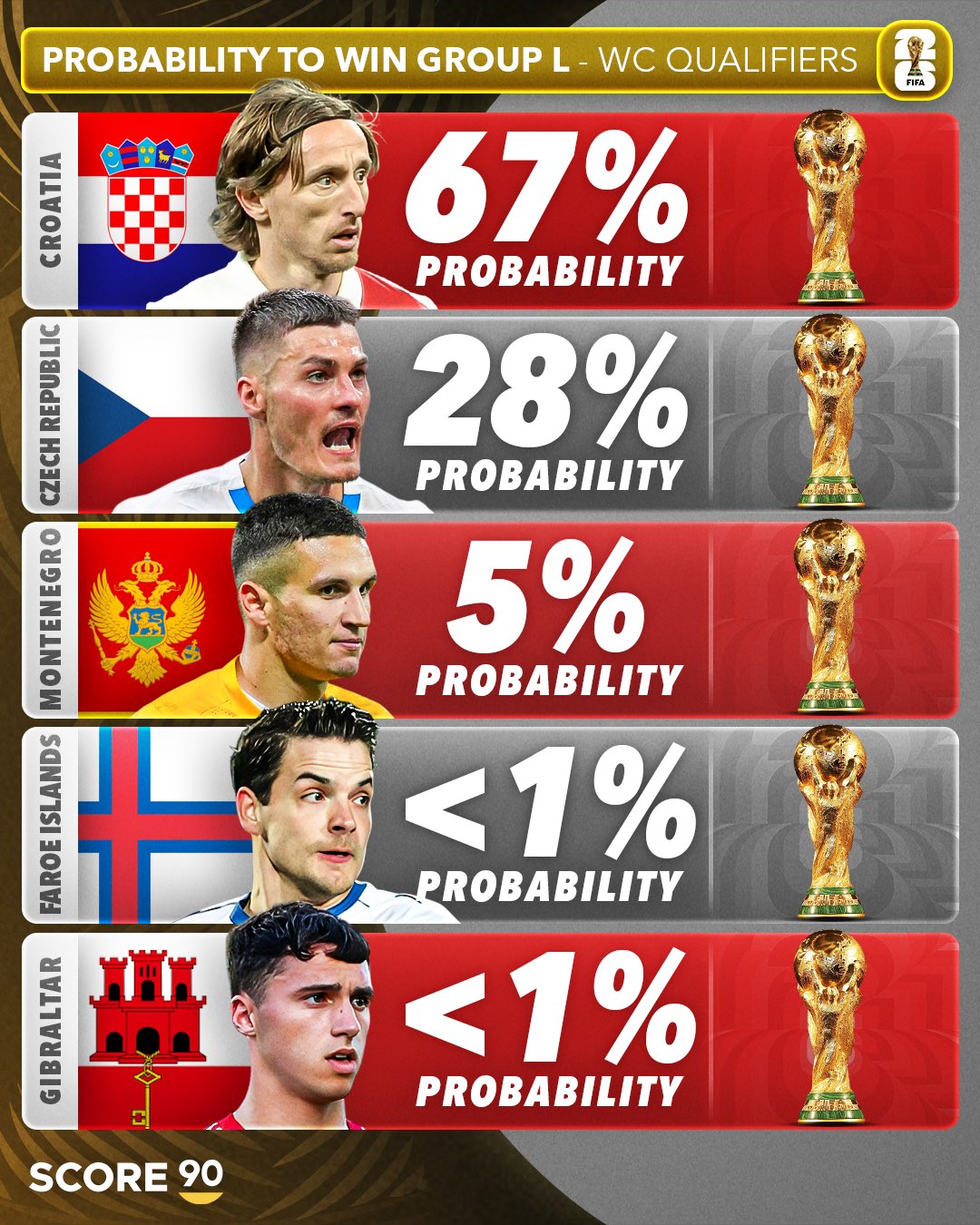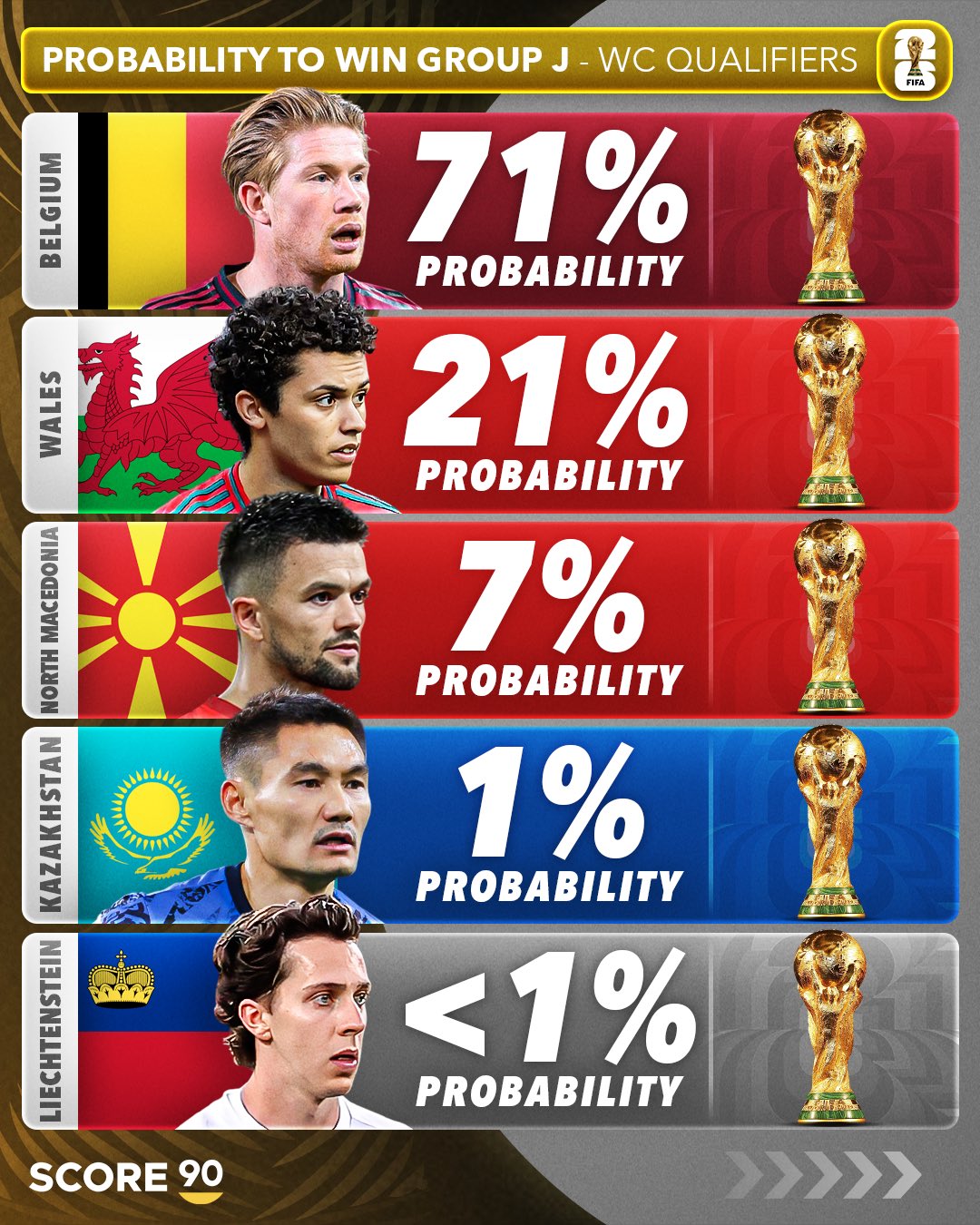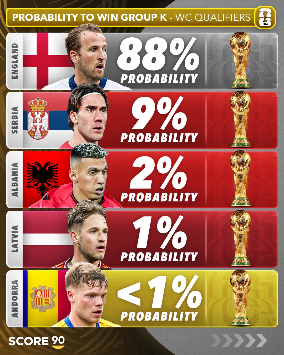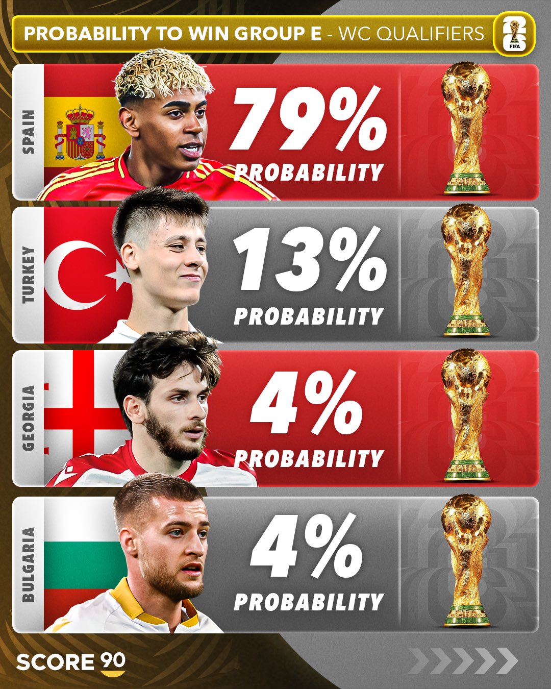 在2026年世界杯欧洲区预选赛第一阶段小组赛激战正酣之时,足球媒体SCORE 90也发布了对于12个个小组54支球队的出线概率预测。