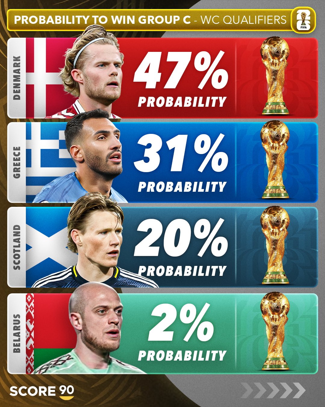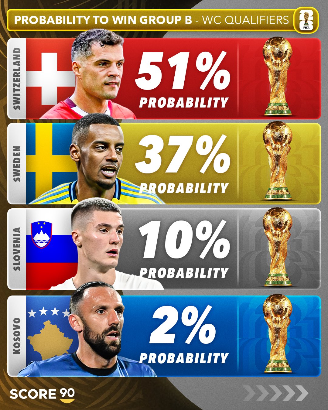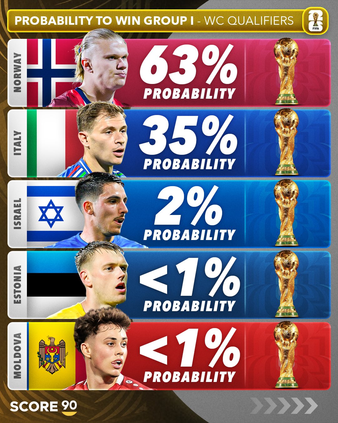 在2026年世界杯欧洲区预选赛第一阶段小组赛激战正酣之时,足球媒体SCORE 90也发布了对于12个个小组54支球队的出线概率预测。