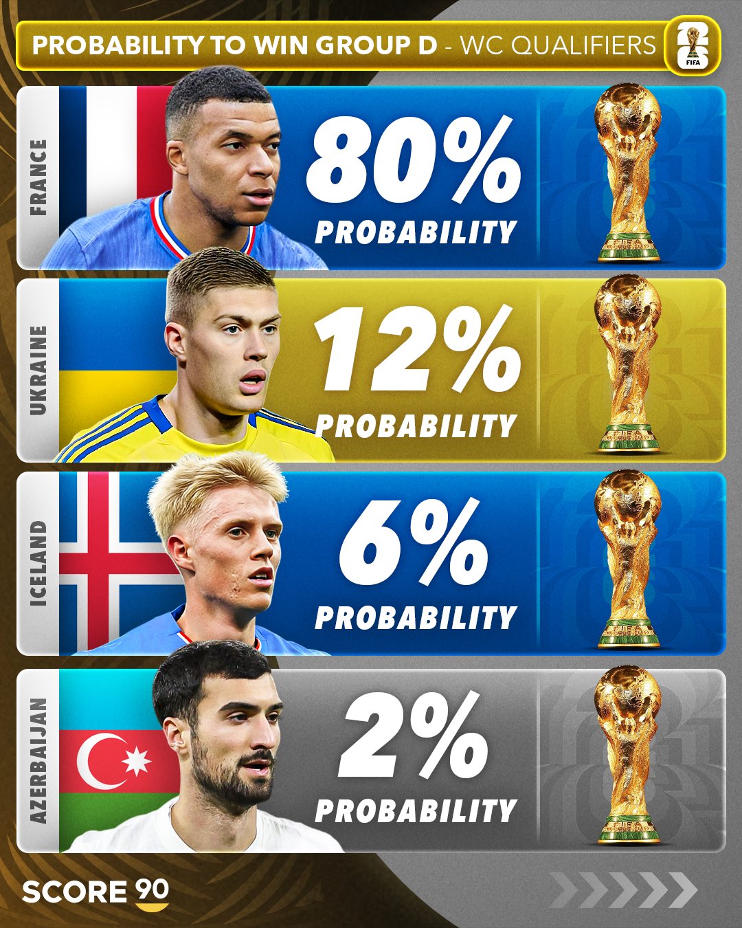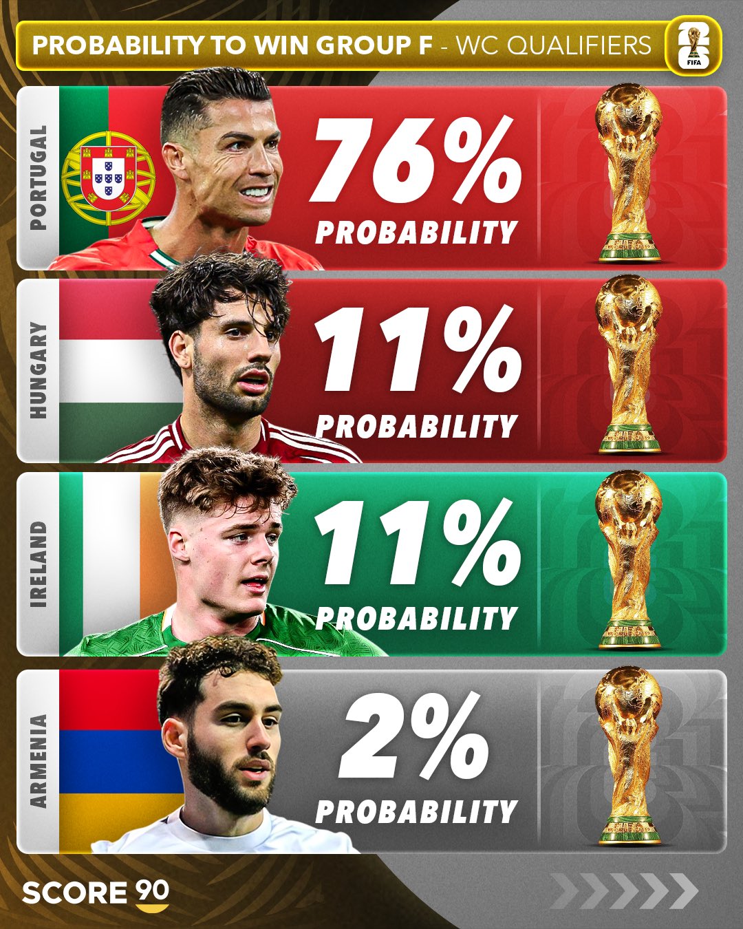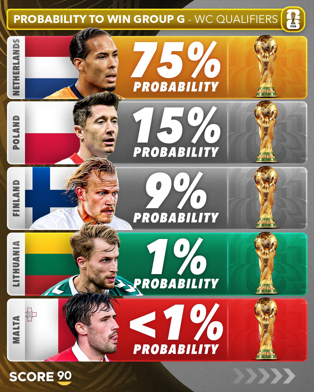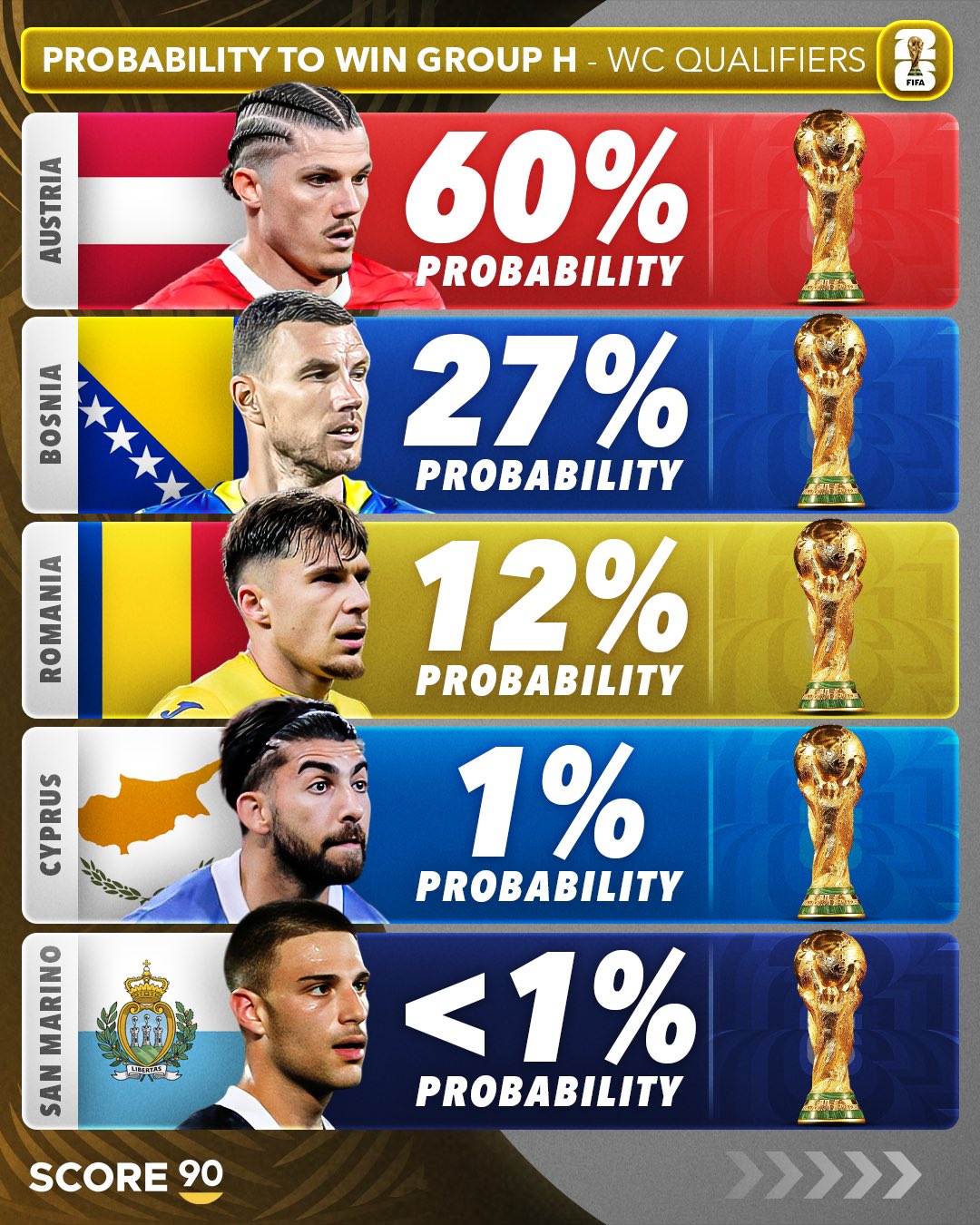 在2026年世界杯欧洲区预选赛第一阶段小组赛激战正酣之时,足球媒体SCORE 90也发布了对于12个个小组54支球队的出线概率预测。