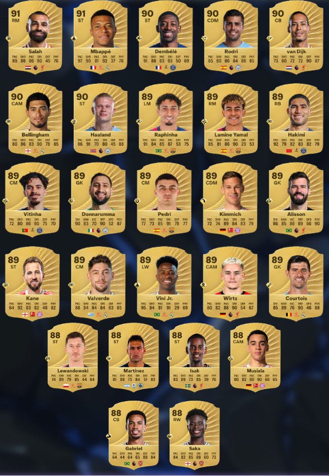 在FC26的评分榜前26名、即评分达到了88分的球员中,也全部来自于目前的五大联赛的豪门球队: