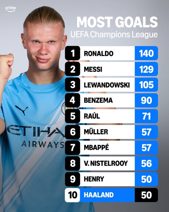 来自于SCORE 90的统计显示,在25岁59天的年龄,哈兰德就打进了个人的欧冠50球,而这样的成绩也让他超越了劳尔,C罗和姆巴佩等一众球星,成为了仅次于梅西、24岁284天的欧冠历史上第二年轻打进50球的球员;