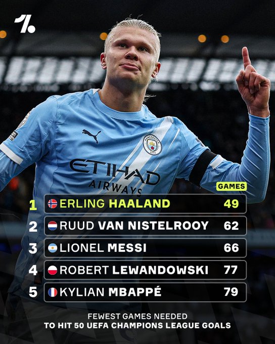 哈兰德成为欧冠历史打进50球第二年轻的球员,仅次于梅西