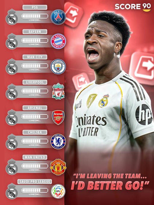来自于SCORE 90的猜测,维尼修斯的去处其实也不过仅有如下4处:英超--曼城,利物浦,阿森纳、切尔西和曼联;德甲--拜仁;法甲--巴黎;沙特联赛--淘金之旅。
