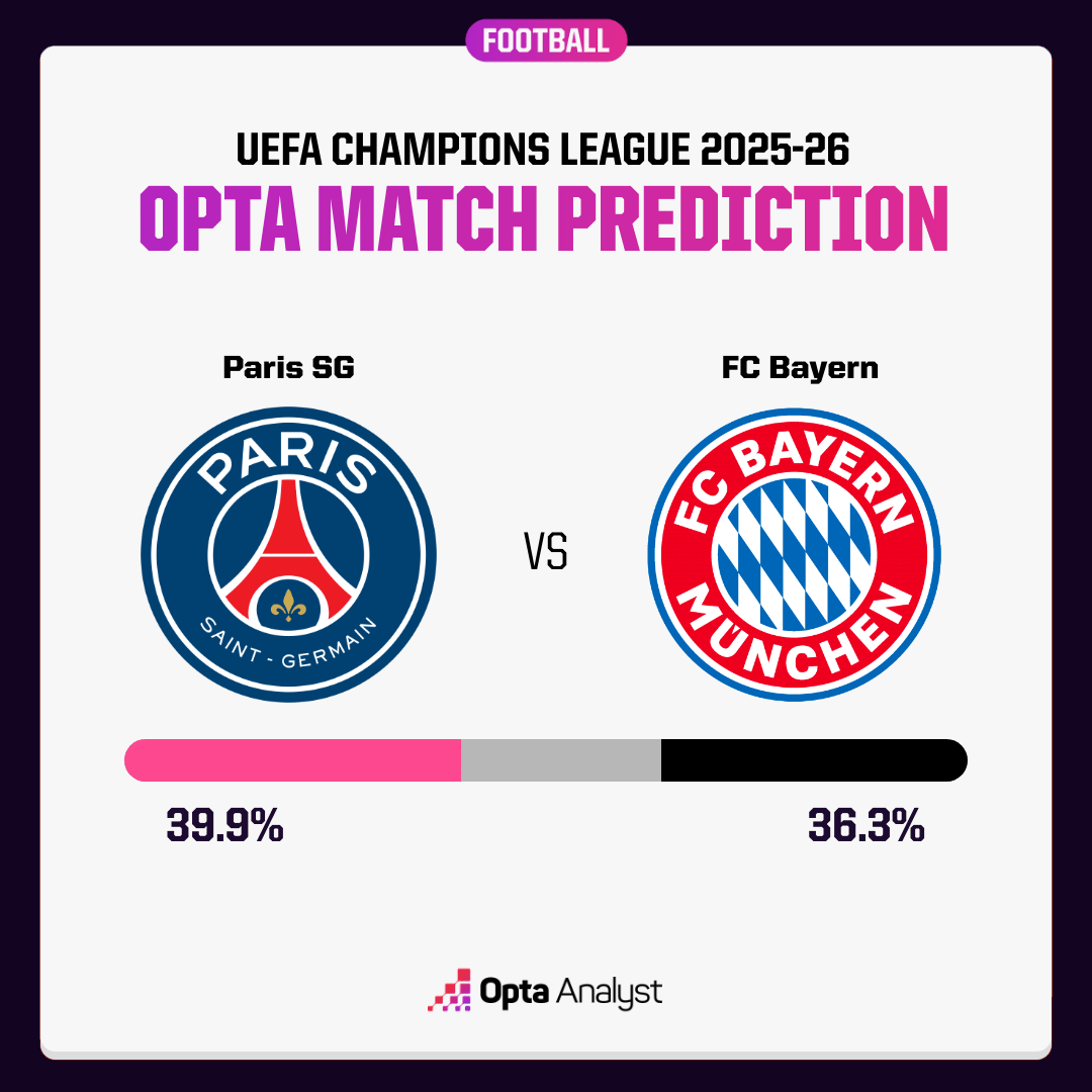 毕竟,就拿Opta之于本场的预测来看,这无疑更是一场势均力敌而赛前很难给出预测的巅峰对话--巴黎胜,39.9%;拜仁胜,36.3%;双方平局,23.8%。