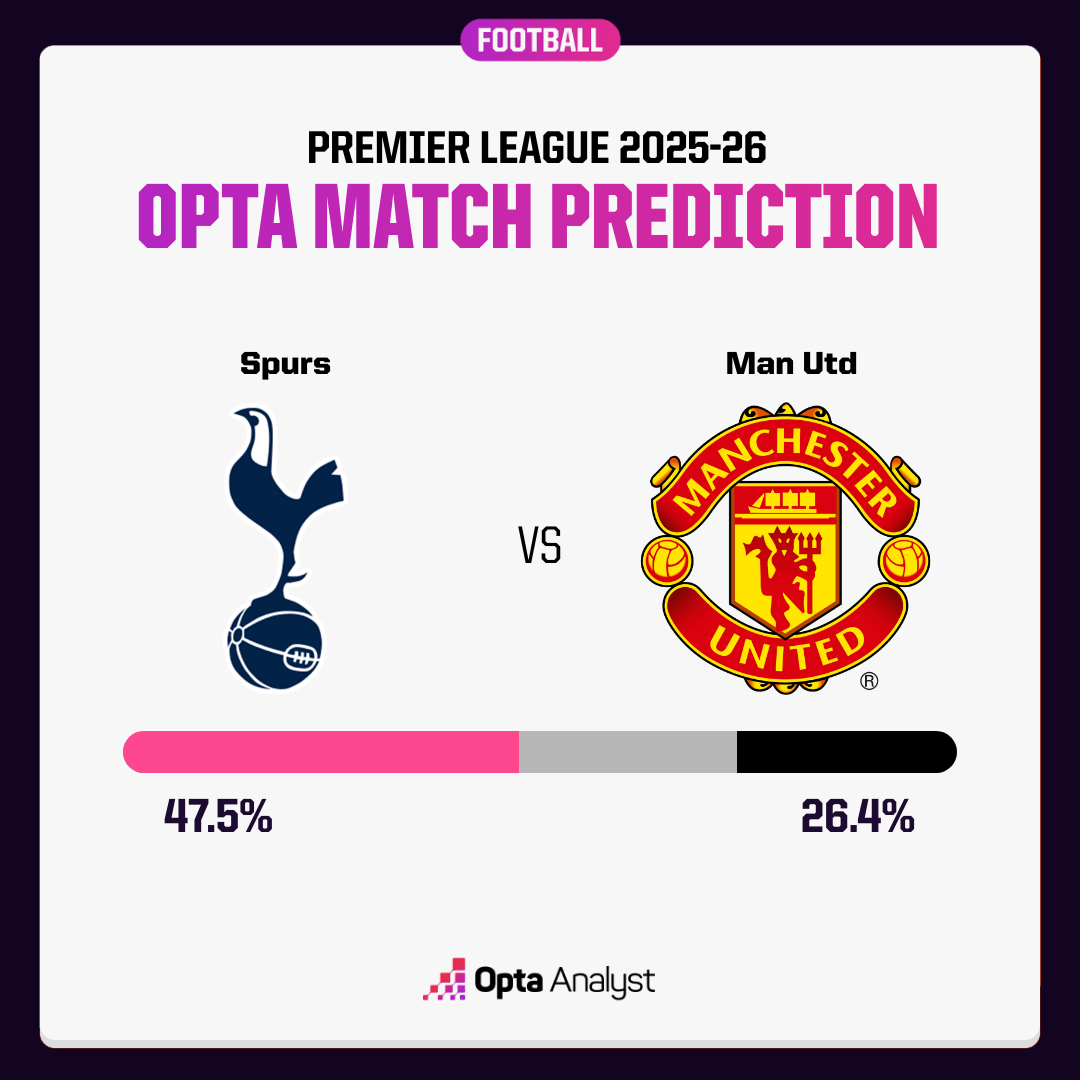 Opta对于本场的预测中,无疑更多的支持还是给予了主队--热刺胜,47.5%;曼联胜,26.4%;双方平局,26.1%。
