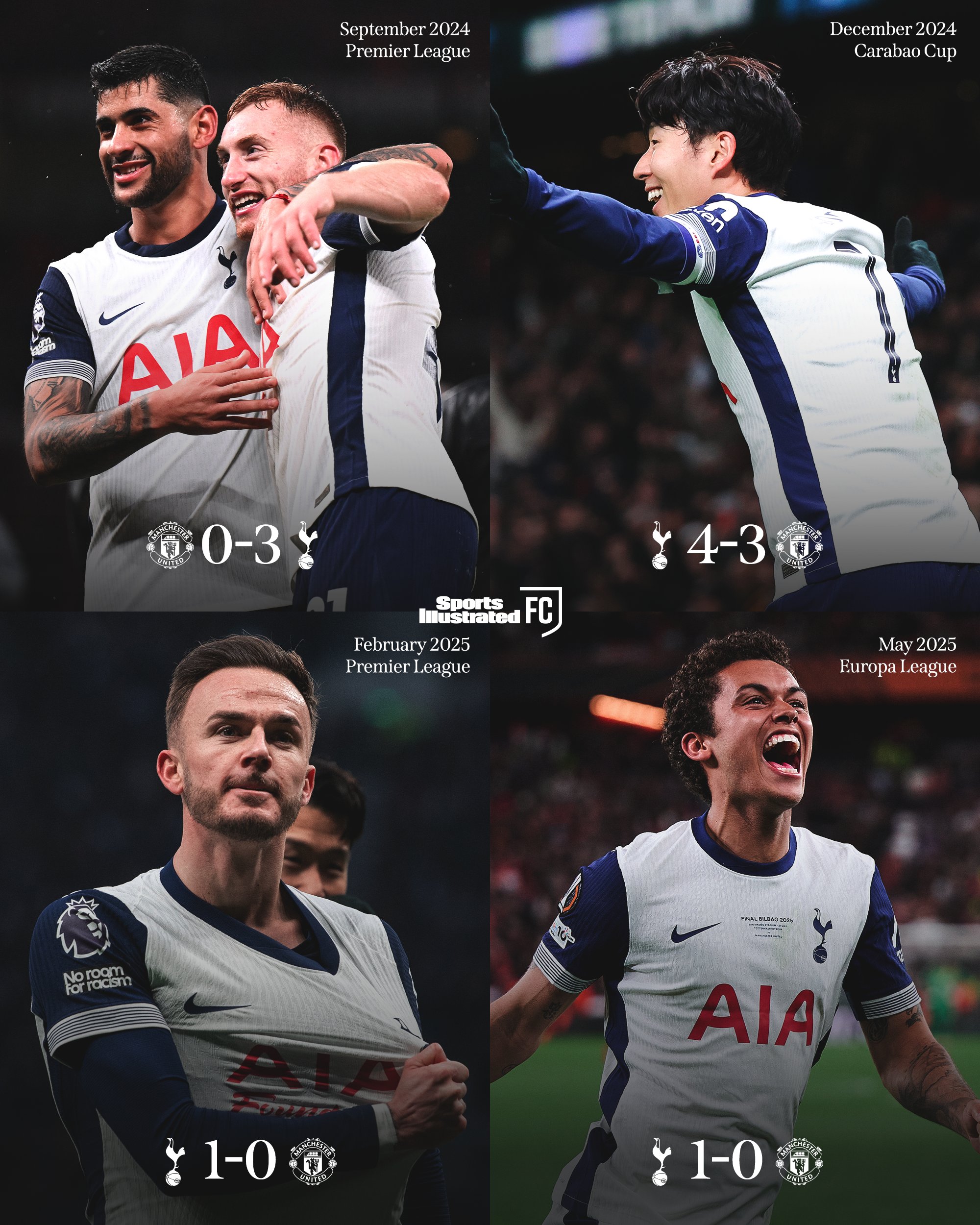 尤其是在上赛季、24/25赛季,热刺在联赛,英联杯和欧联决赛的4杀曼联,无疑让球队在面对红魔之时占据了绝对的主动权--在这4场比赛中,热刺取得了9:3的巨大净胜球优势,甚至更是在其中的3场比赛零封了曼联的结果,无疑更是暴露了曼联进攻端效率低下的问题。