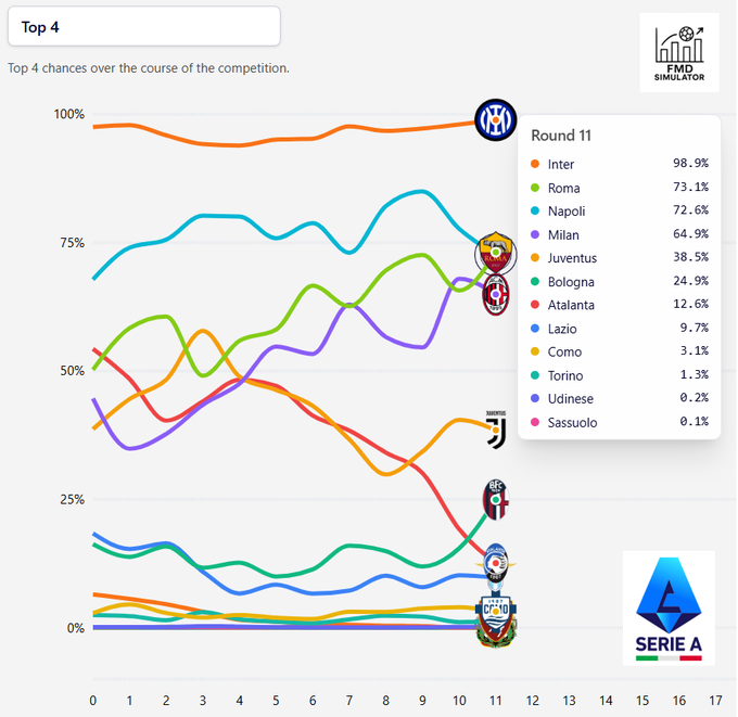 意甲球队晋级26/27赛季欧冠概率排名(意甲下赛季或有4支球队有望出战欧冠):