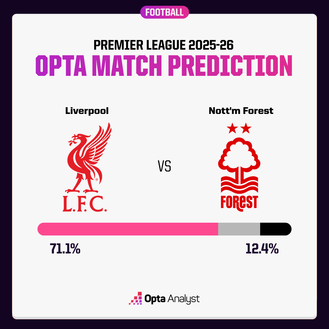 至少,Opta并未如此看待本场较量--利物浦胜,71.1%;森林胜,12.4%;双方平局,16.5%。