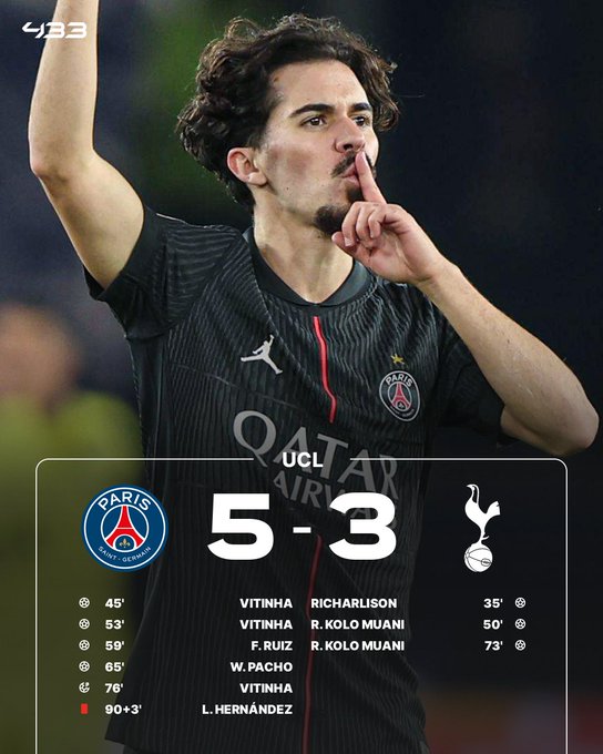 但,下半场却完全是不同的走势--第50分钟的穆阿尼帮助热刺反超比分后,第53分钟维蒂尼亚的梅开二度和第59分钟的法比安、第65分钟的帕乔以及第76分钟维蒂尼亚所完成的帽子戏法,更终让巴黎在本场的进球数达到了5粒。尽管穆阿尼曾在第72分钟打进一球,但也难以阻挡巴黎的疯狂攻势。