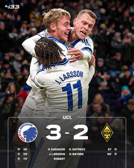 在本场比赛中,尽管主队哥本哈根在第26分钟凭借达达松,第59分钟的拉尔森和第73分钟的罗伯特建立了3球领先。然而,第81分钟的萨特帕耶夫和第90分钟巴伊贝克的进球,却让凯拉特在临近比赛结束之前将比分变为了2-3差点扳平比赛。