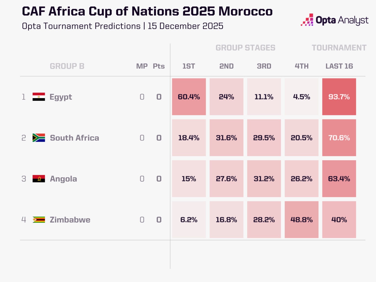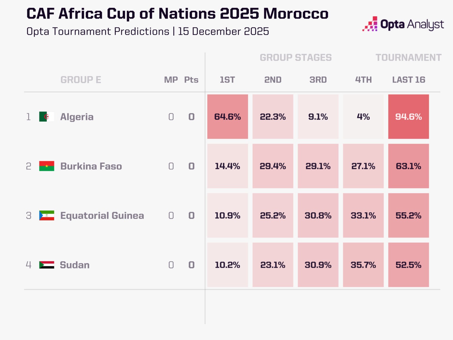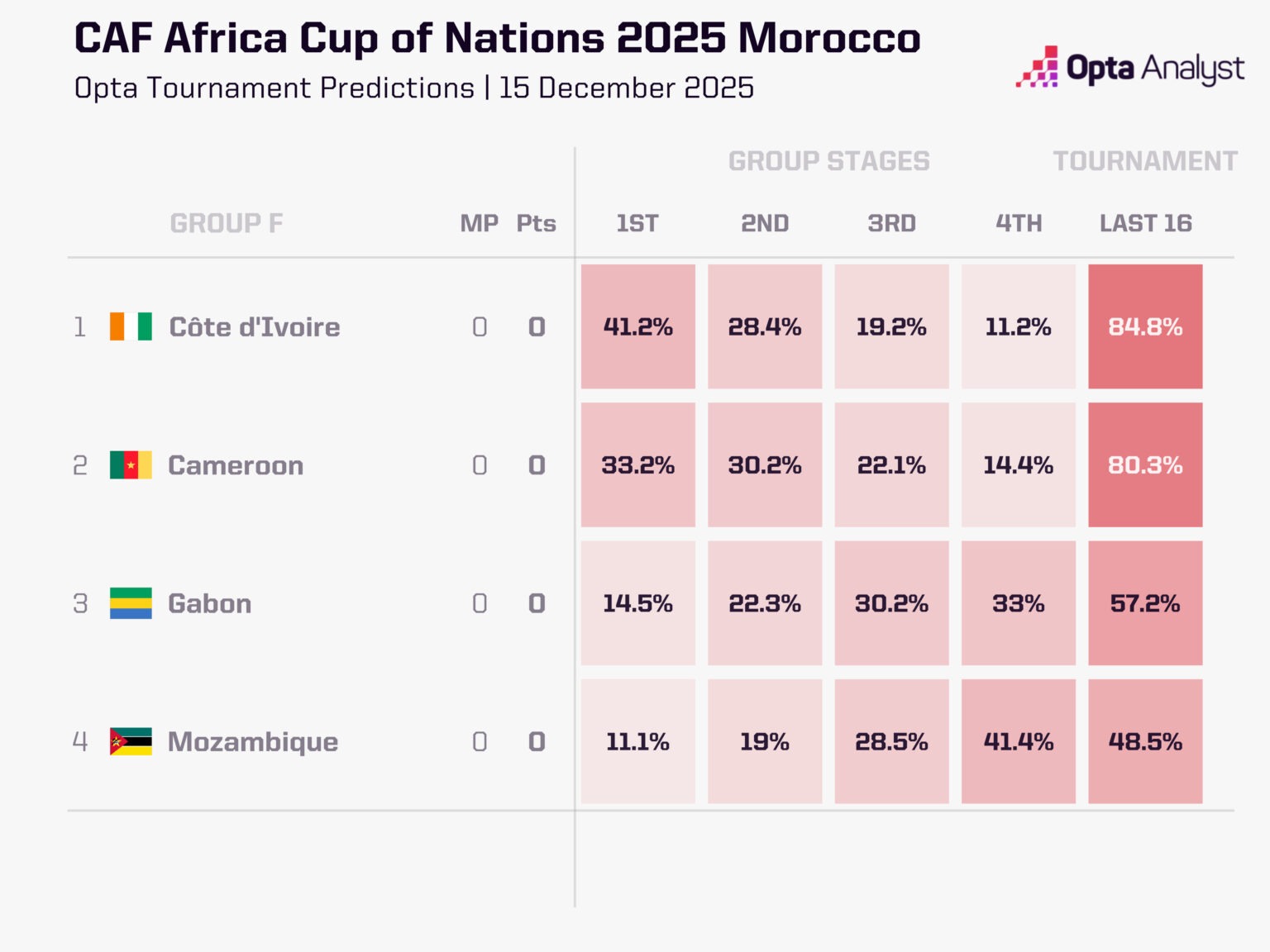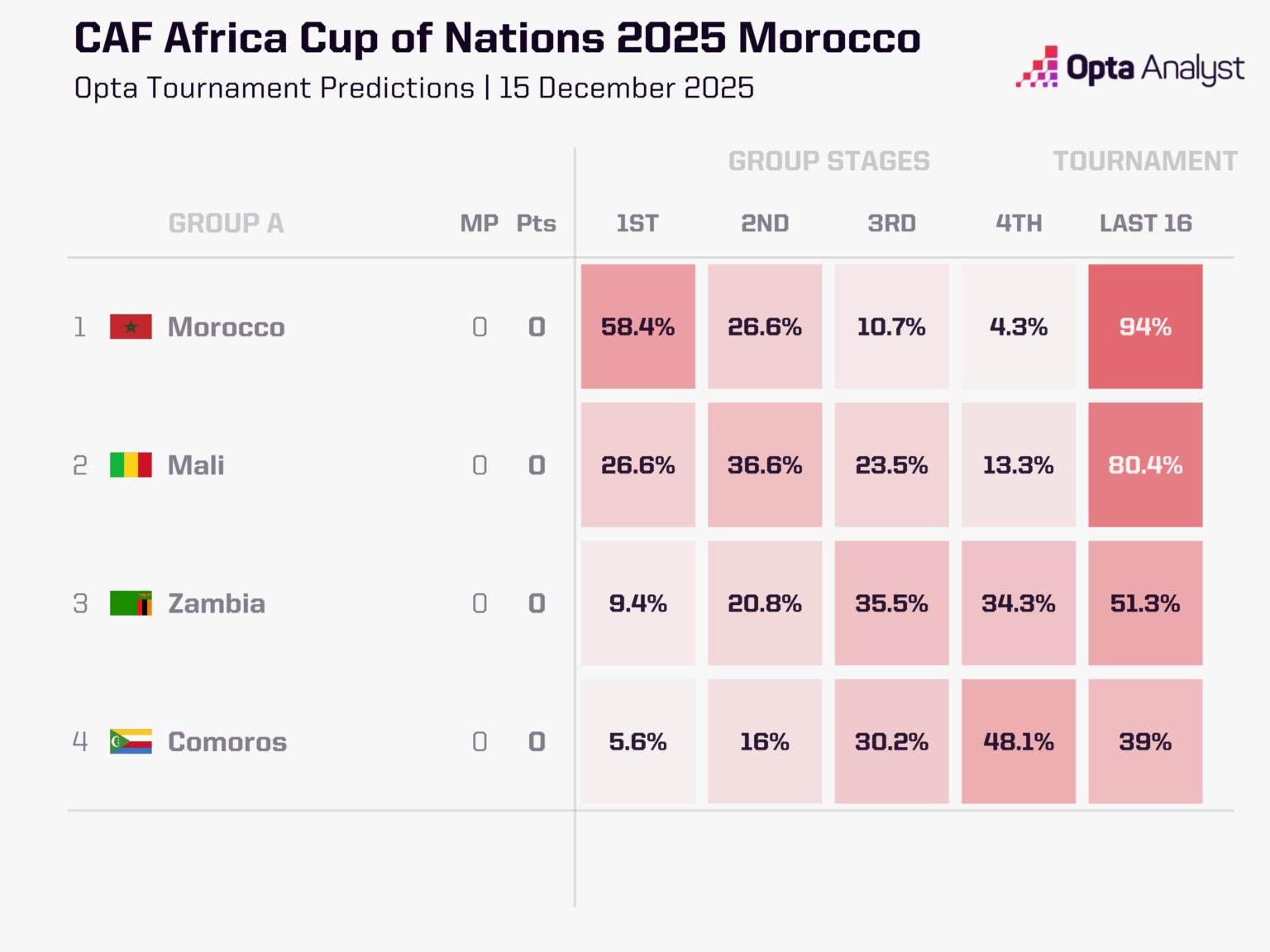北京时间12月22日03:00开始,2025年非洲杯的对决将开启大幕。而在赛前,Opta也对于本届非洲杯的夺冠前景和各小组出线的概率进行了详细的赛前预测。