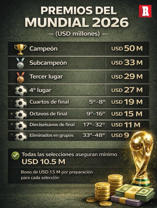 日前,2026年美加墨世界杯的官方公布了明年赛事的总奖金金额以及48支参赛球队所能获得的奖金数额。