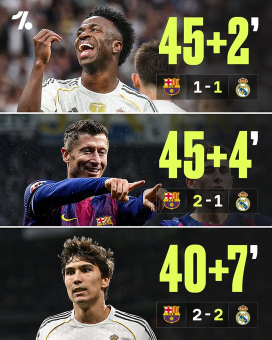 然而,意外却在半场的补时到来了--第45+2分钟,维尼修斯的进球帮助皇马扳平了比分;第45+4分钟,莱万的进球令巴萨再一次获得了领先;第45+6分钟,贡萨洛-加西亚的进球,不仅令双方完成了补时4分钟之内的连续3粒进球,更是让比分直接来到了2-2;