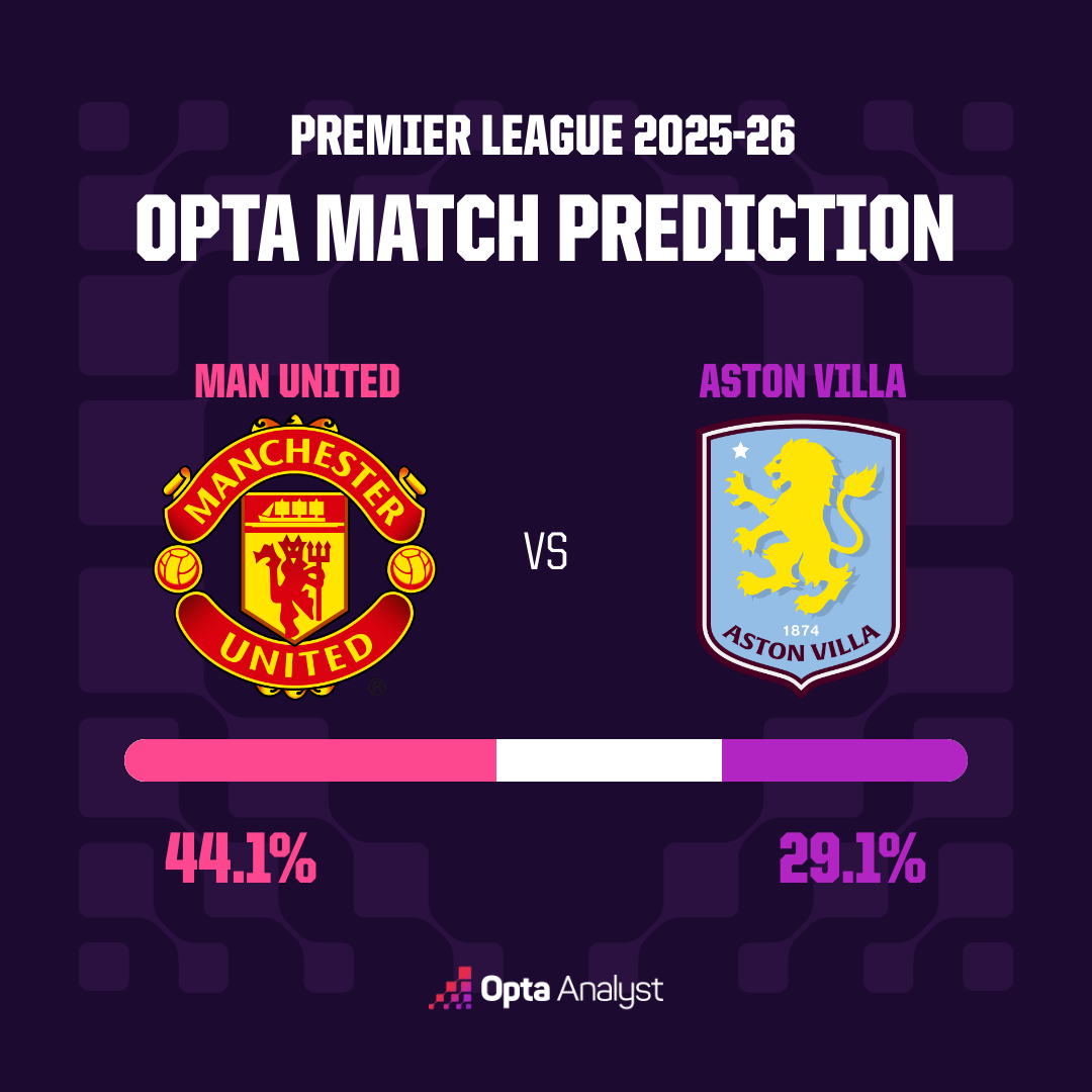 所以,在Opta的预测中,红魔无疑成为了本场的相对优势方--曼联胜,44.1%;维拉胜,29.1%;双方平局,26.8%。
