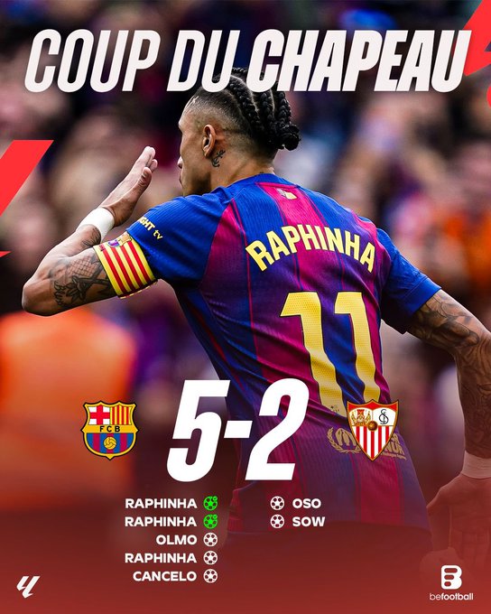 下半场易边再战,第51分钟拉菲尼亚成功完成带帽的情形和第60分钟坎塞洛斩获回归之后的第一球,则让比分瞬间来到了5-1;比赛结束前的第90+2分钟索乌的进球,更终将比分定格在了5-2。