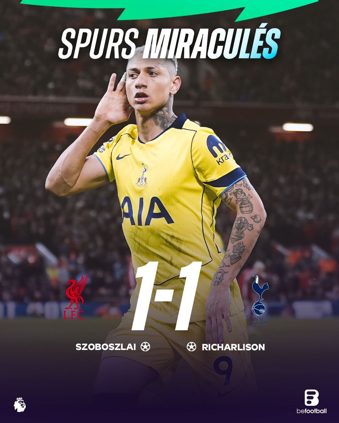 而到了下半场均没有太好进攻机会的双方,则直至第90分钟才由努力了一整场的热刺扳平了比分、穆阿尼的盘带给利物浦的禁区制造了险情后助攻里沙利松完成了绝平球的打进!