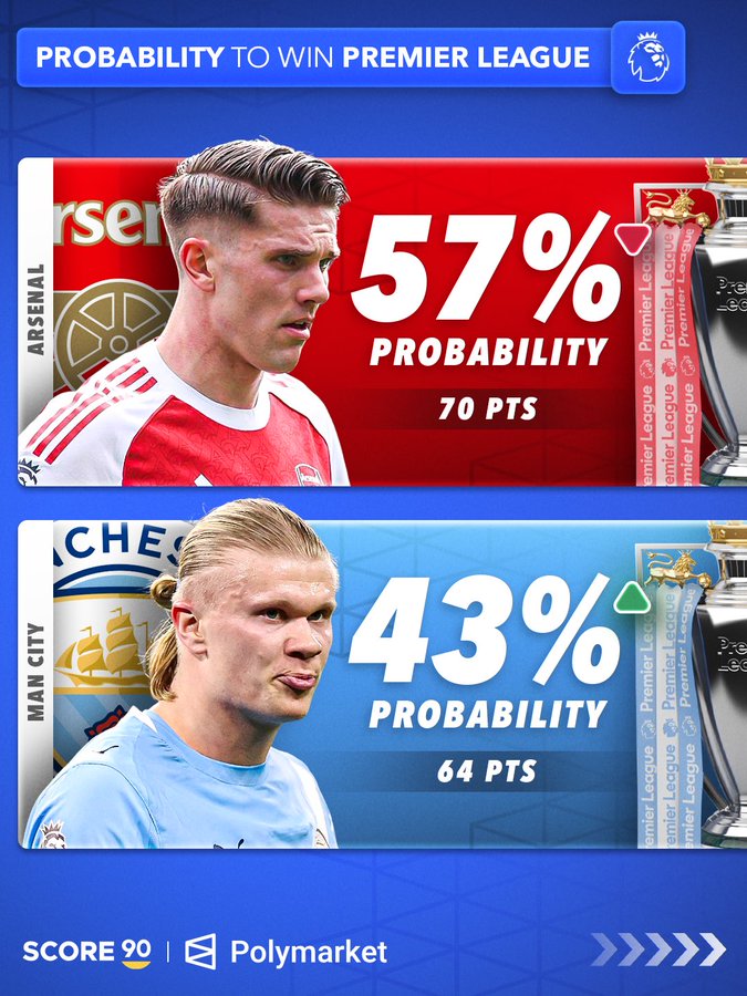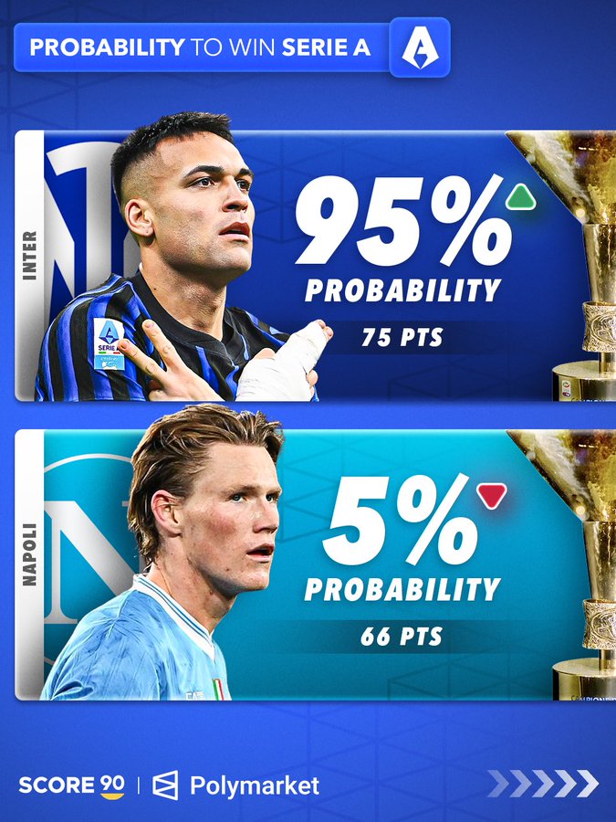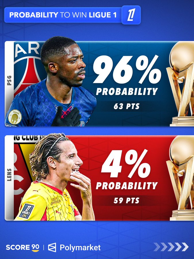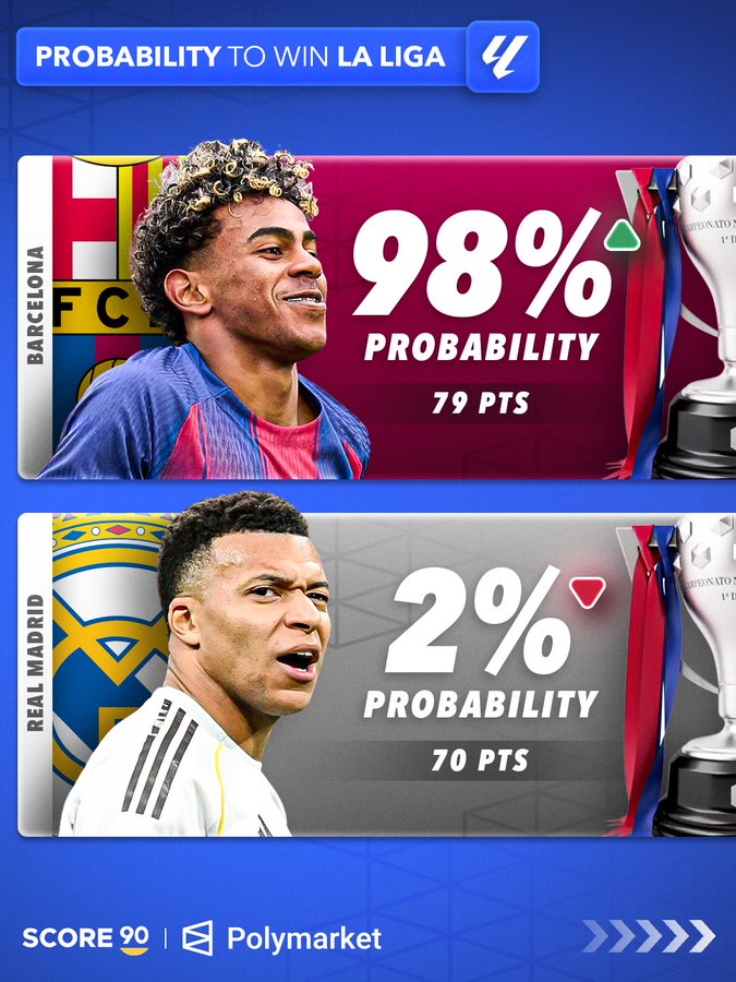 随着上周末五大联赛的较量全部结束,SCORE 90也通过Polymarket的更新预测数据,发布了本赛季五大联赛争冠前景的预测。而从结果来看一个明显的特点便是、除却英超之外,其余的四大联赛其实争冠悬念已经没有了!