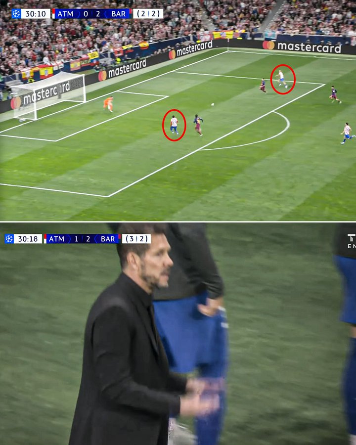 而在经过暂停之后,马竞也立即通过他们更擅长的反击,由卢克曼打进一球的同时,也让他们终于在大都会球场完成了总比分的再度领先、3-2;