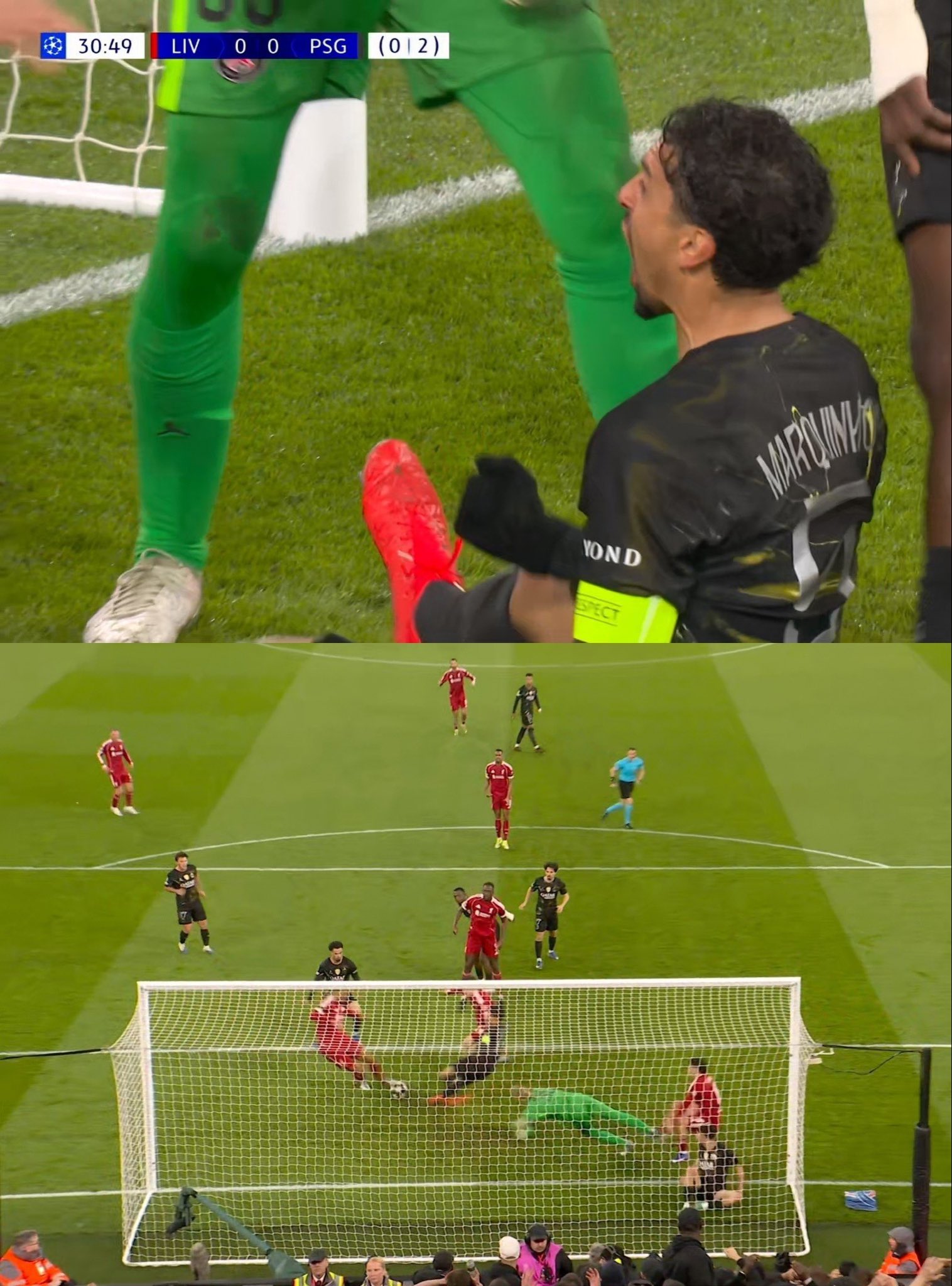 本场比赛第32分钟,利物浦的确迎来了打进第一球的绝佳机会--凯尔凯兹的射门被扑出后,皮球落到了队长范戴克的脚下,正当所有人以为利物浦队长会由此掀起反击的号角之时,巴黎对阵马尔基尼奥斯的飞身拦截,也阻挡了利物浦上半场更好的时机!
