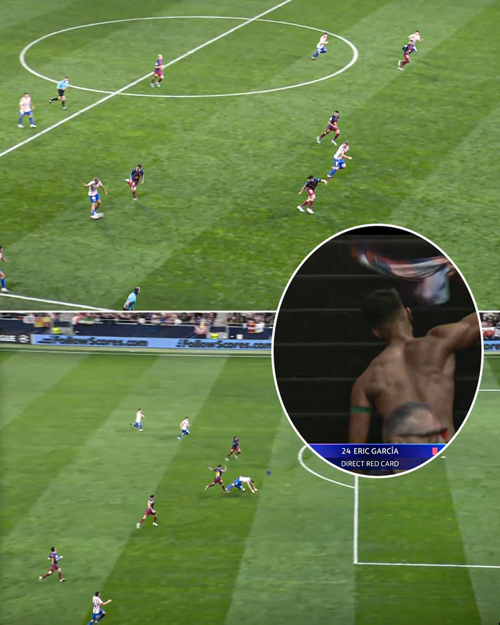 下半场比赛第79分钟,巴萨再度吃到红牌--加西亚的离场,让巴萨连续两场面对马竞的欧冠之时,都要被罚下一人导致10打11!