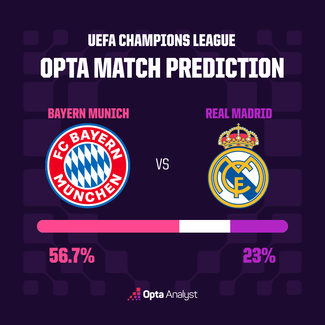 Opta的预测,同样看好南大王--拜仁胜,56.7%;皇马胜,23%;双方平局,20.3%。