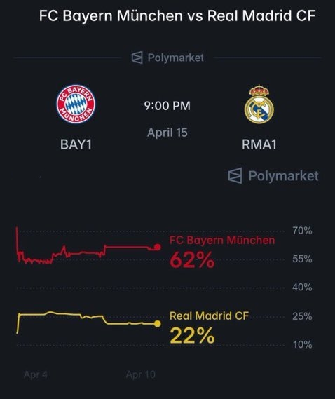 Polymarket的预测--拜仁取胜62%,皇马获胜22%,双方平局16%。