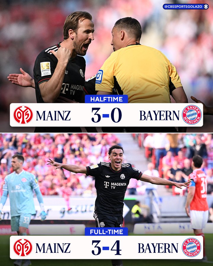 美因茨3-4拜仁:拜仁客场让3追4、上演超级惊天大逆转!